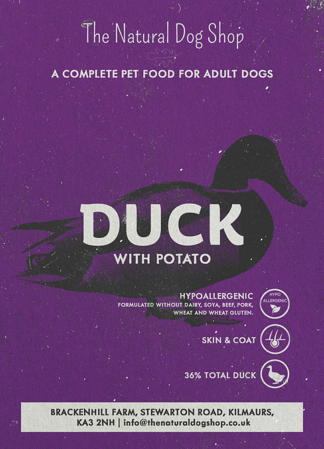 Duck 36% (Including Dried Duck 27%, Duck Fat 7% & Duck Gravy 2%) Potato (31%), Peas, Beet Pulp (7%), Brewer’s Yeast, Linseed, Minerals, Vitamin