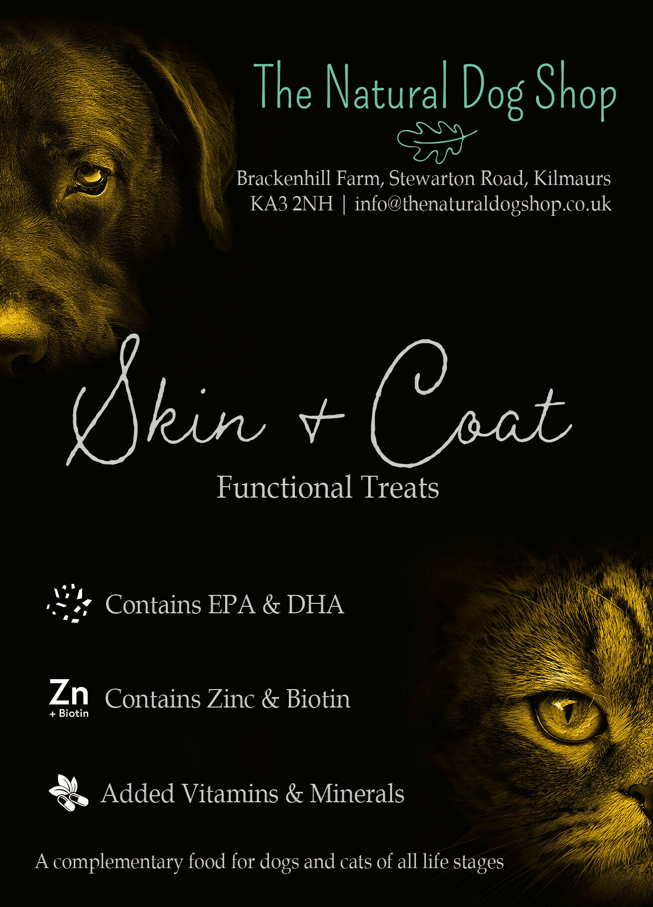 Zinc and biotin help the body maintain healthy skin and a shiny coat by supporting the growth and production of skin cells.