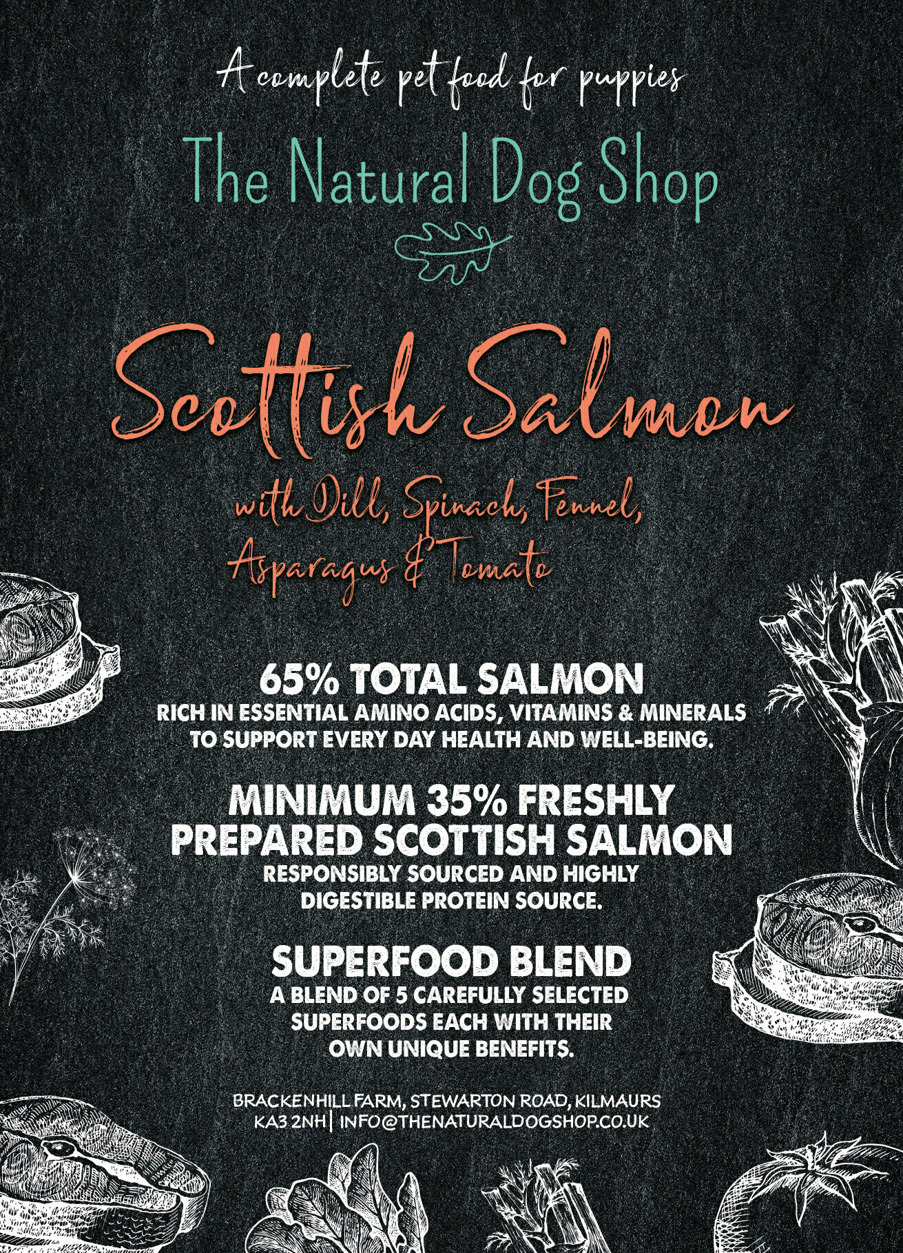 65% Salmon (35% Freshly Prepared Scottish Salmon, 23% Dried Salmon, 4% Salmon Oil & 3% Salmon Stock), Sweet Potato, Beans, Beet Pulp, Dried Superfood Blend* (Including Dill, Spinach, Fennel, Asparagus, Tomato), Omega 3 Supplement, Minerals, Fructooligosaccharides (FOS, 192 mg/kg), Mannanoligosaccharides (MOS, 48 mg/kg), Olive Extract (0.01%
