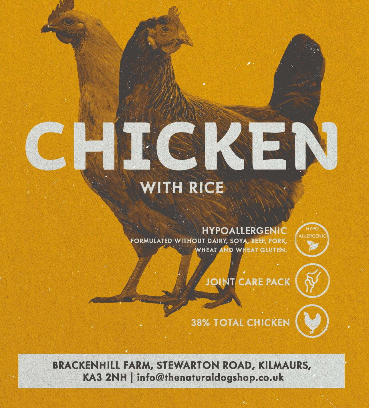 Chicken 29% (Including Dried Chicken 26% & Chicken Fat 3%), Rice (29%), Barley, Oats, Beet Pulp (2%), Brewer’s Yeast, Minerals, Yucca Extract (190 mg/kg